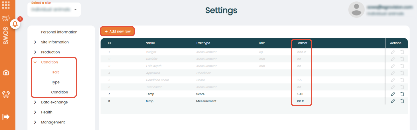 Now, go to the "Type" setting. Here, you can create traits that need specifically to be sent to breeding companies or that will help you to analyze or filter on a specific trait. General condition types that are used across the entire customer base as well as general condition types for breeding organizations will be available right away (e.g. weight or backfat and TN End for Topigs breeders).