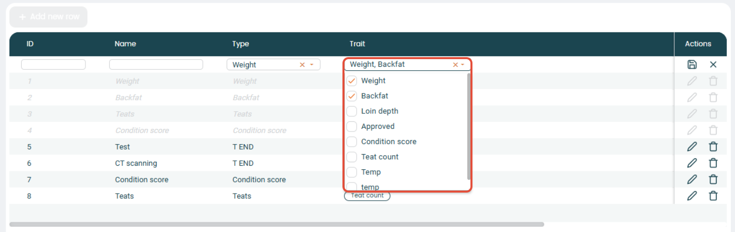 In the "Trait" setting, you can setup any traits or measurements. Start by clicking "+ Add new row" to start entering a new trait. Assign the trait an ID, enter a name, and select a trait type from the dropdown menu in the "Trait type" column.