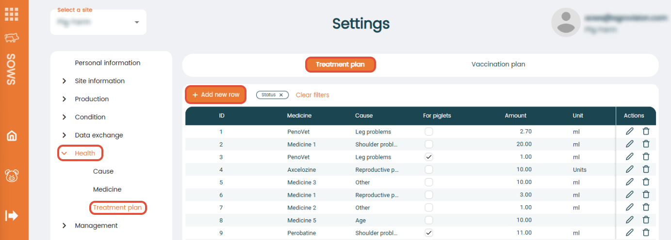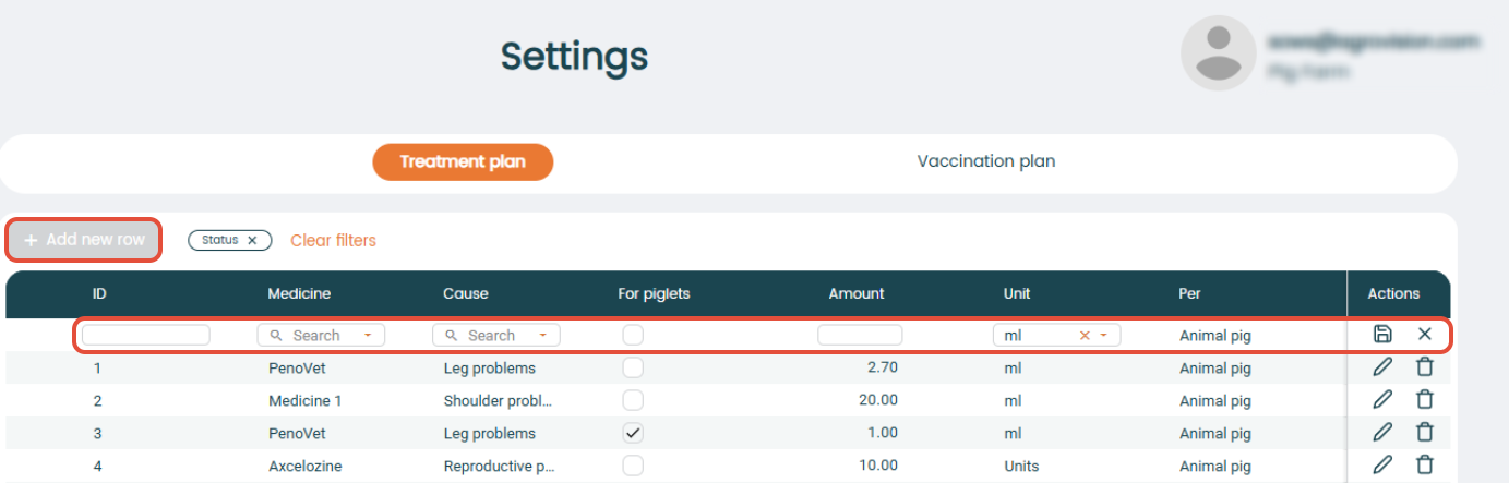 - "For piglets": Decide whether the treatment plan applies for piglets by adding/removing the check mark.