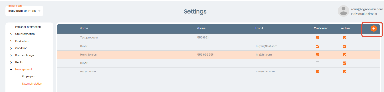 In the menu External relations, you can add any third parties related to the farm or herd: such as customers. To register a new one click the "+" icon located in the upper right corner of the table and fill in the required information.