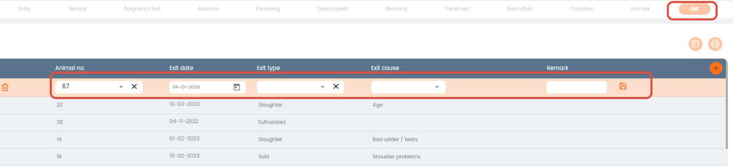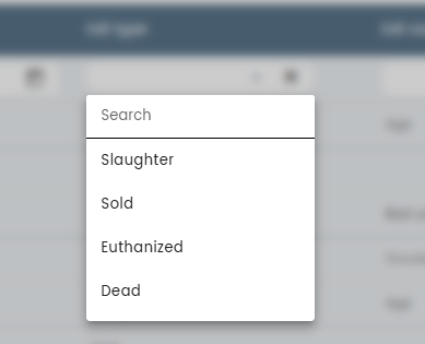 When entering the date, it is possible to choose which type of exit happened for the given animal. Click on dropdown in the Exit type column to select: