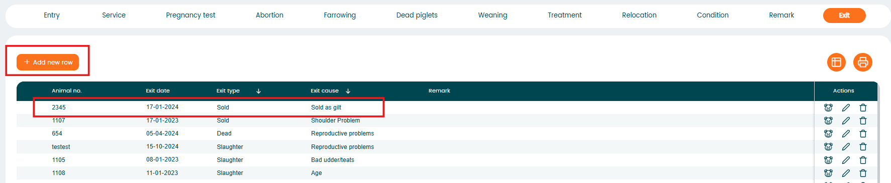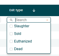 The "Exit" function is used to register animals that leave the farm, for example due to slaughter, sale, death, or euthanasia.