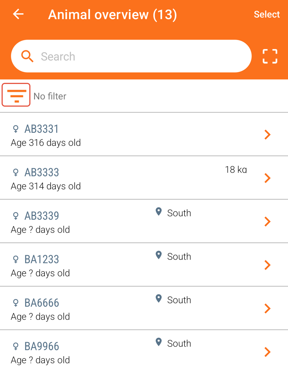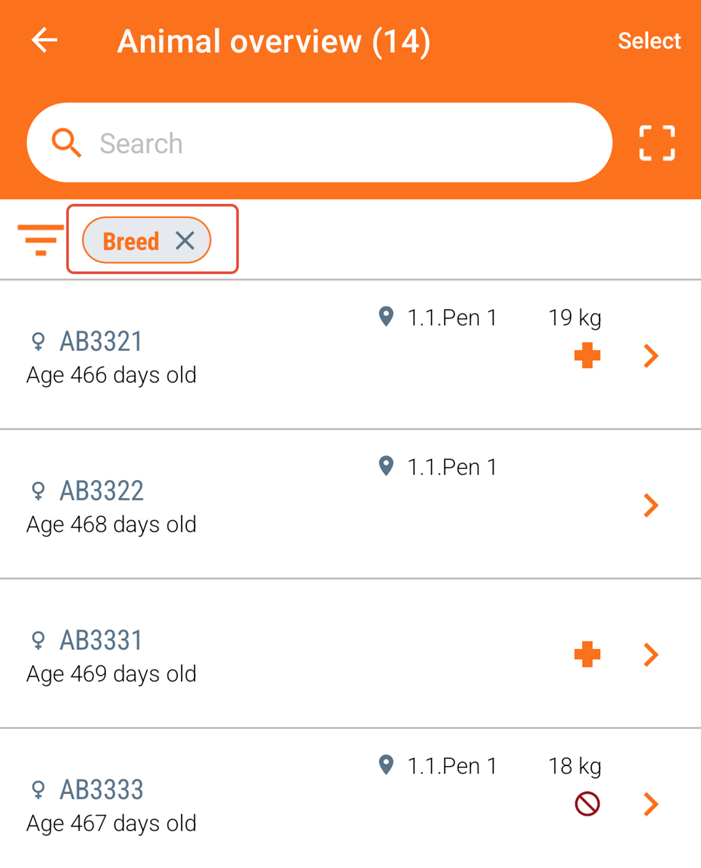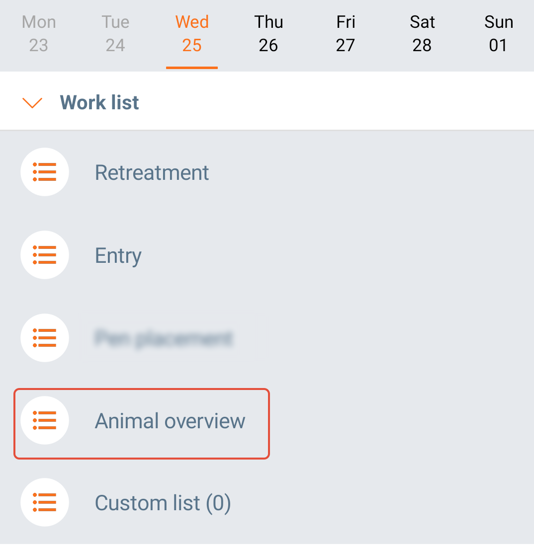 To choose animals based on specific criteria, open the worklist "Animal overview" from the app's main screen.