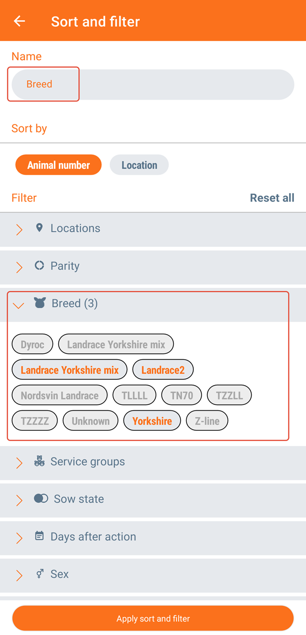 Here, you have the option to establish one or more criteria for including animals on the list. You can create as many work lists as you want. Filter animals based on the criteria listed below and choose your preferred sorting method: by animal number or by location. To save this selection, write a name for this worklist. Click "Apply sort and filter".