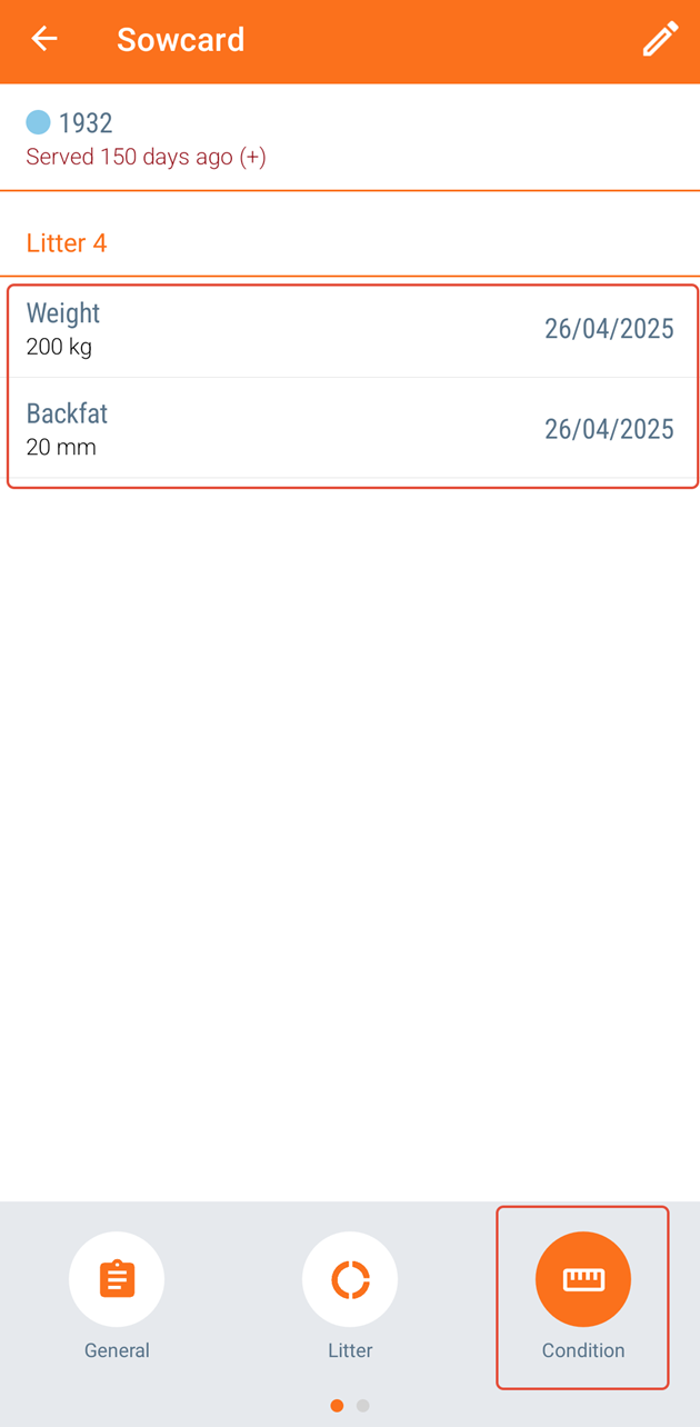 All conditions registered on an animal will be visible on the animal card by clicking on the "Conditions" icon on the bottom.