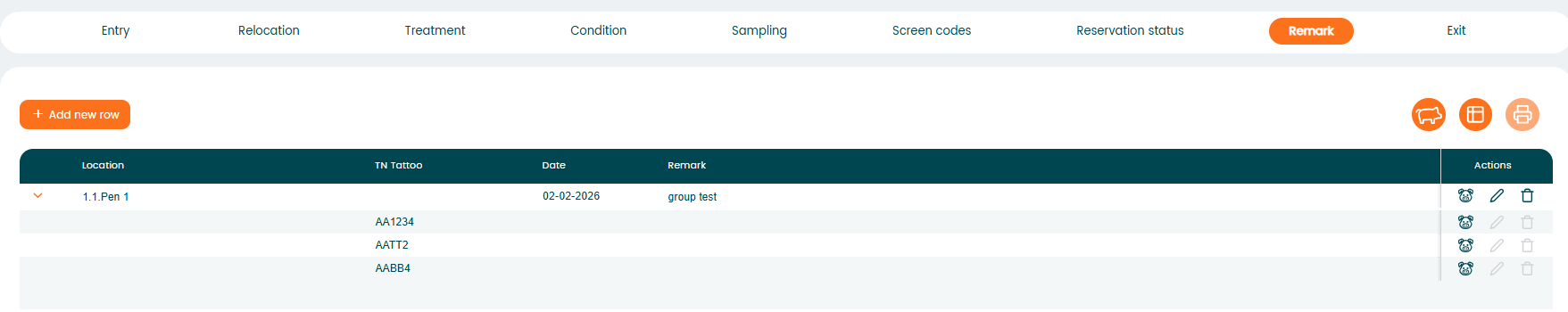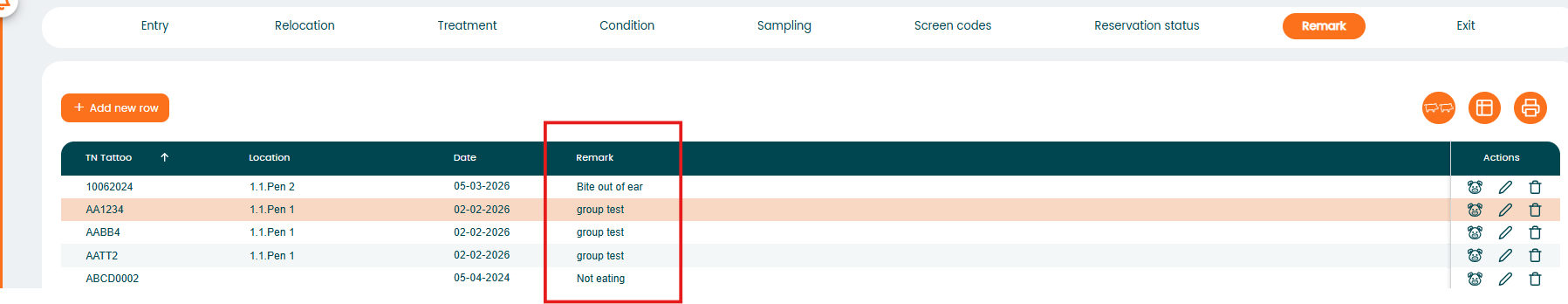 Click "+ Add new row" and enter the animal number, date, and the text in the "Remark" field.