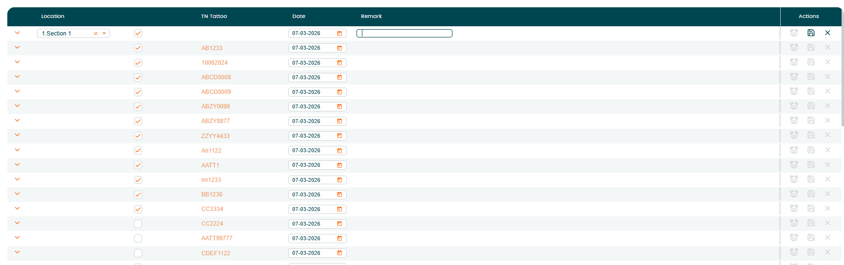 Click the arrow icon in front of the location name to expand the list. The system will display all animals currently in that location. By default, all animals are selected. If needed, uncheck the animals that should be excluded from the remark.
