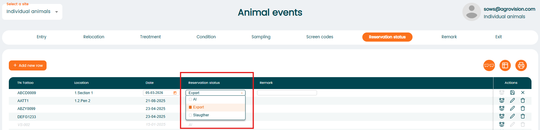 Select the animal and appropriate reservation type (AI, Export or Slaughter).