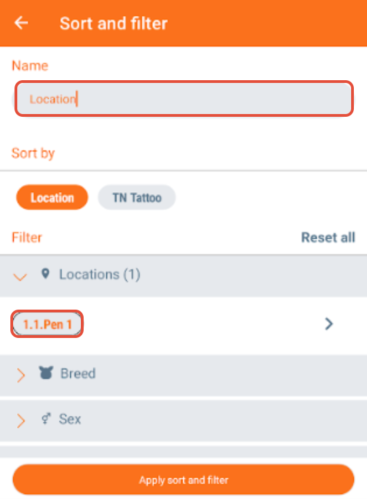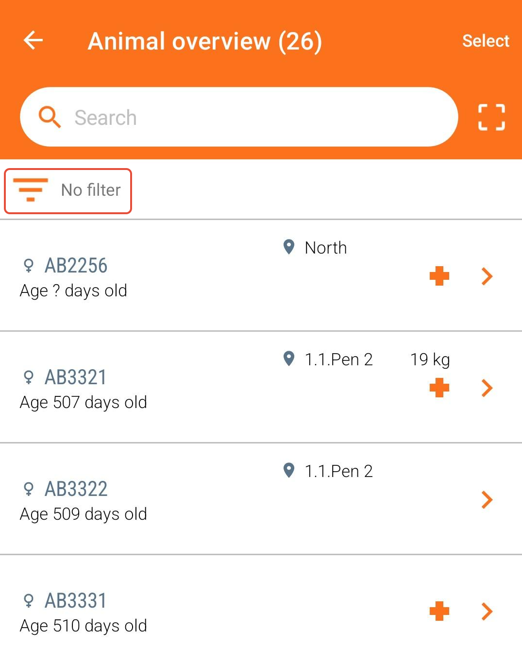 Click "Apply sort and filter". A list of animals matching the selected criteria will appear.