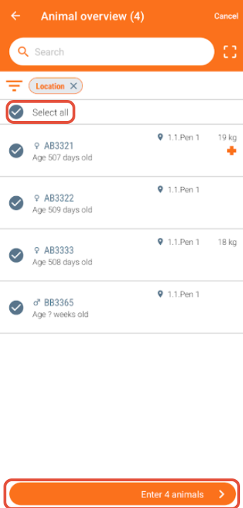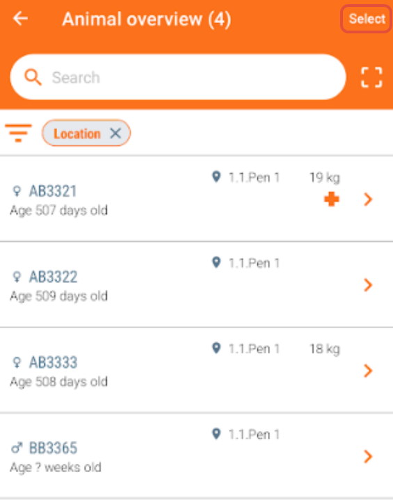 Click "Select" at the top of the screen to choose animals for registration. Click "Select all" if you want to register an event for all animals in the list.