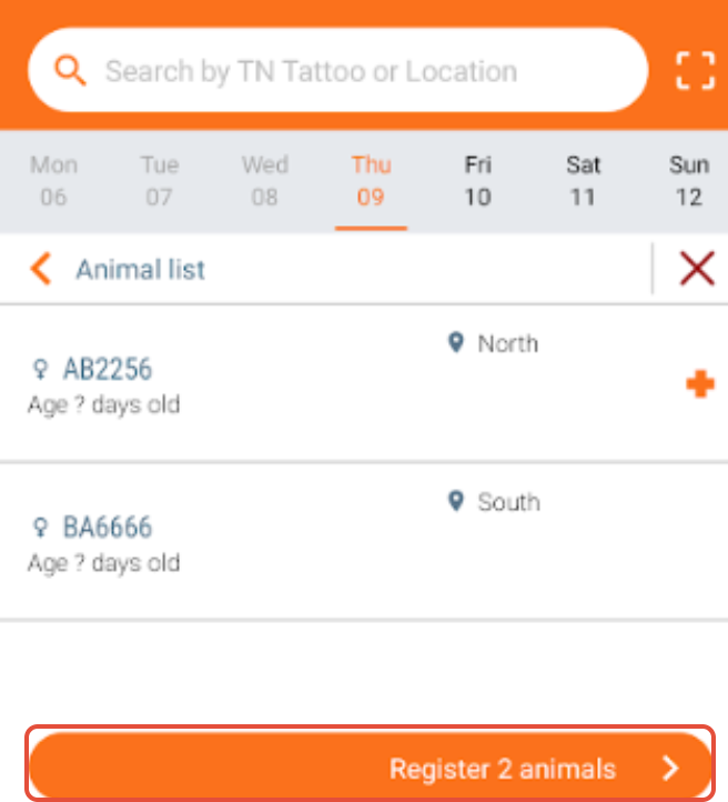 Click on "Register x animals" and select the event you want to register on these animals. The following steps are the same as described above under "Animal overview"