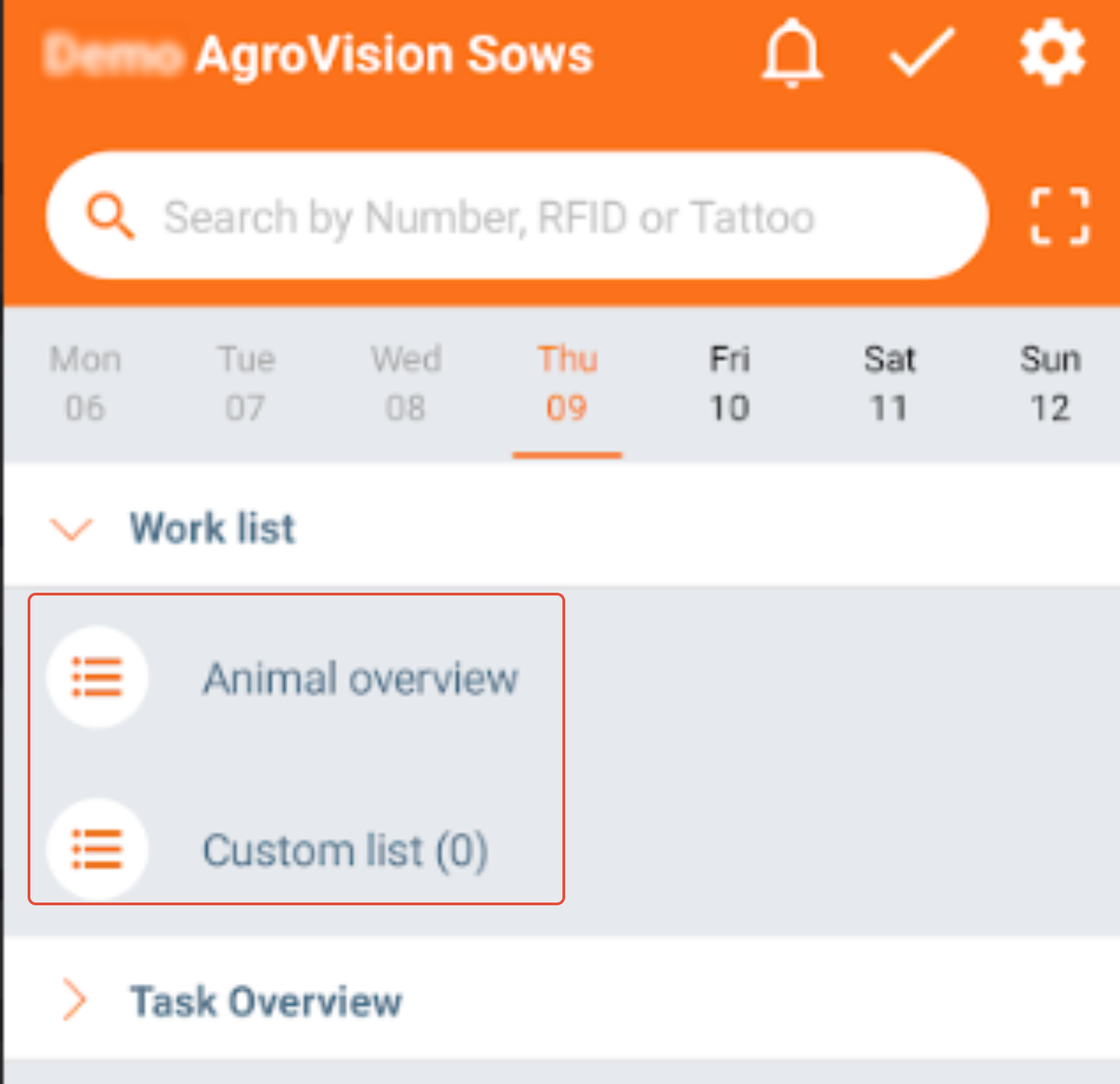 To do this, use the "Work Lists" menu on the home screen. This makes it easy to select groups of animals and register events efficiently.