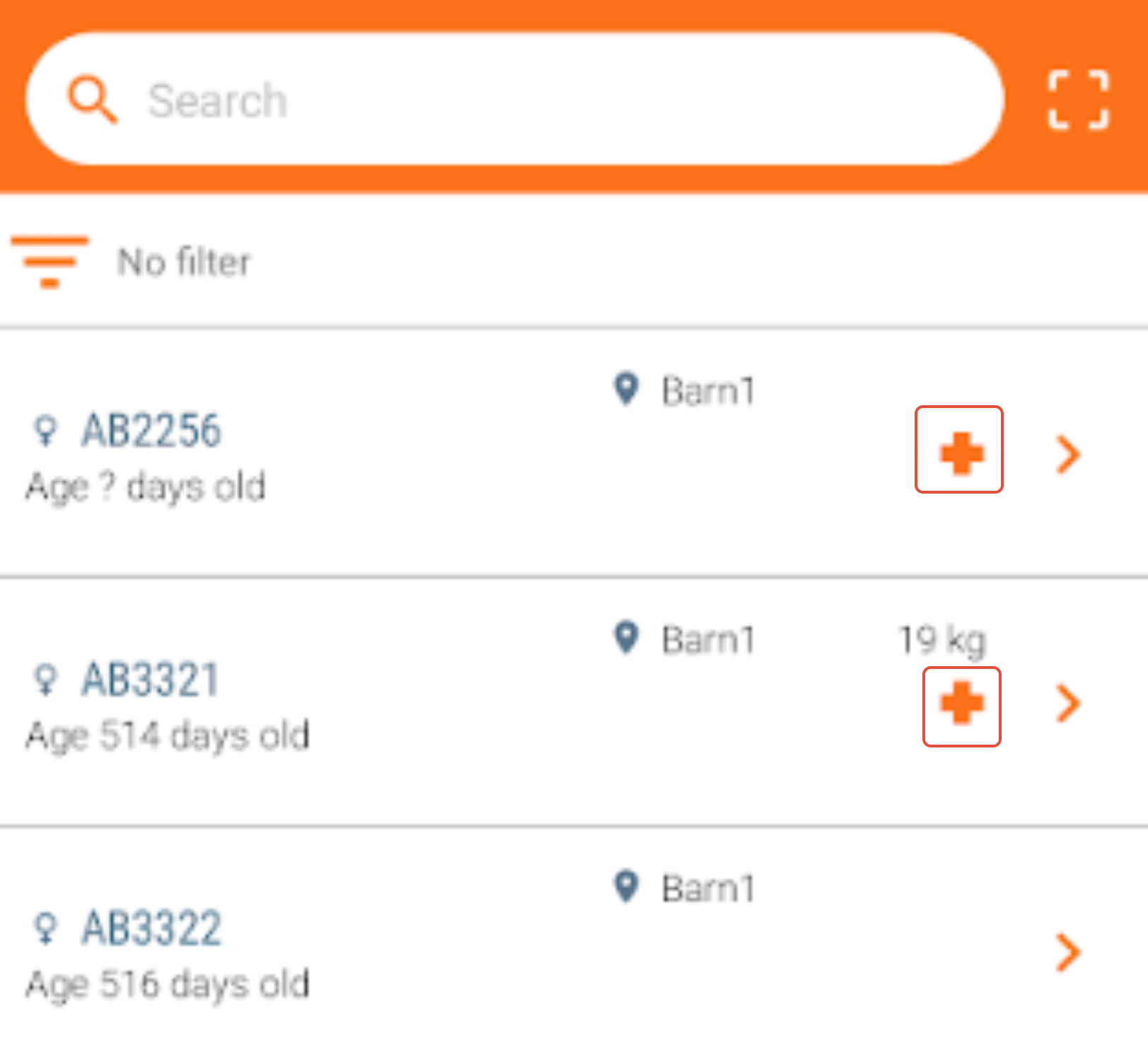 - A “+” symbol next to the animal number indicates retreatment is needed. Click on "+" to enter the treatment.