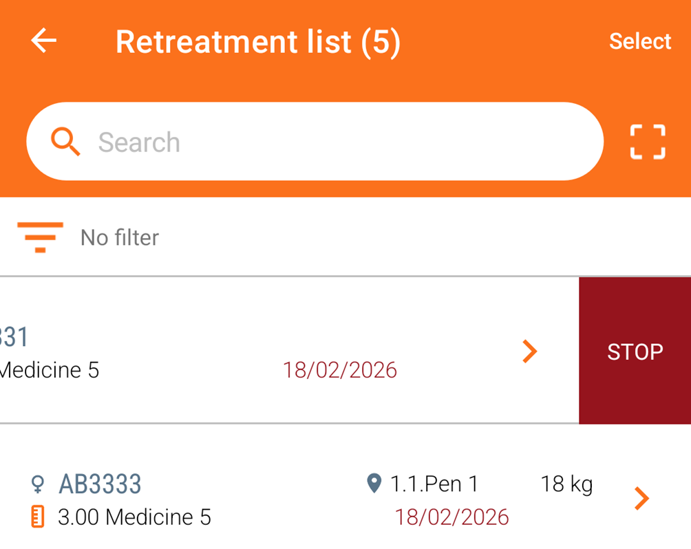 - Stop an animal’s retreatment by swiping the treatment to the left until the "STOP" button appears.