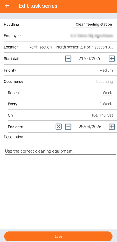 Select the field you want to change, enter new information (e.g. a new location), and click "Save". After synchronizing, the task will be updated in the web app as well.