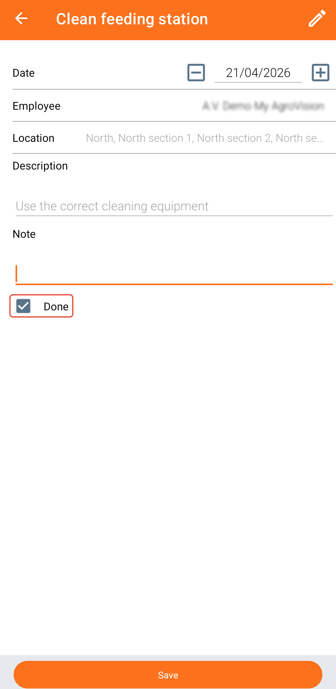 You can select today's or any future date to view tasks scheduled for that day. To perform a task, tap on it to see its description. For example, the task may specify which locations must be cleaned and provide instructions on how to clean them. Once the task is completed, you can add a note (optional) and check “Done.” Press “Save,” and the task will disappear from the "Task Overview" on the home screen.